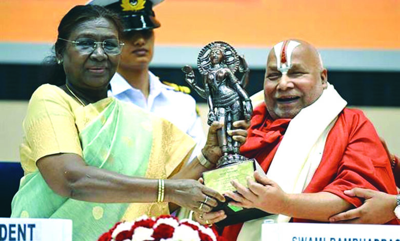 राष्ट्रपति श्रीमती द्रौपदी मुर्मु द्वारा साहित्य के क्षेत्र में उनके योगदान के लिए स्वामी श्री रामभद्राचार्य को प्रदान किया यह सम्मान